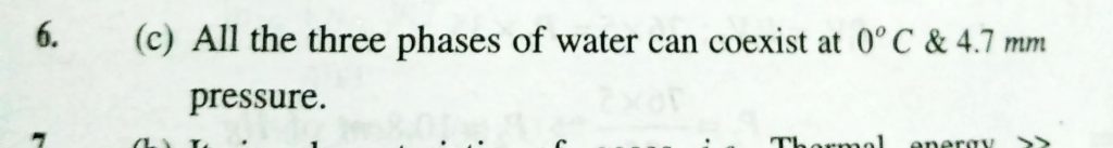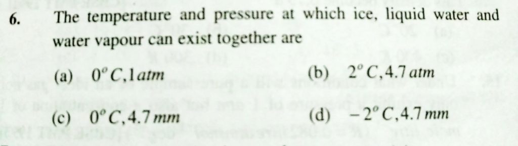 The temperature and pressure at which ice, liquid water and water vapour can exists torether are (a) 0 degrreC, 1 atm (b) 2 degree C, 4.7 atm (c) 0 degree C , 4.7 mm (d) -2 degree C , 4.7 mm 1 atm (b) 2 degree C 4.7 atm (c) 0 degree C 4.7 mm 4.7 mm (d) -2 degree C liquid water and water vapour can exists torether are (a) 0 degrreC The temperature and pressure at which ice February 10, 2021 Category: Uncategorised (JEE Advanced Physics by BM Sharma + GMP Solutions) , Facebook Messenger WhatsApp Share this:TwitterFacebook Related