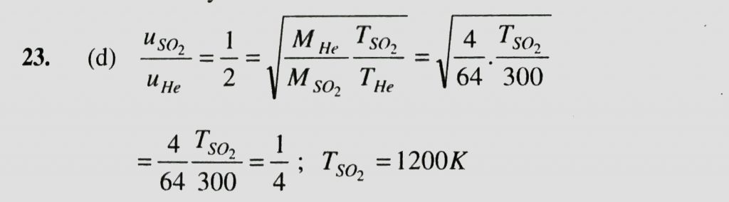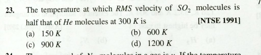 The temperature at which RMS velocity of SO2 molecules is half that of He molecules at 300 K is (a) 150 K (b) 600 K (c) 900 K (d) 1200 K The temperature at which RMS velocity of SO2 molecules is half that of He molecules at 300 K is (a) 150 K (b) 600 K (c) 900 K (d) 1200 K February 11, 2021 Category: Uncategorised (JEE Advanced Physics by BM Sharma + GMP Solutions) , Facebook Messenger WhatsApp Share this:TwitterFacebook Related