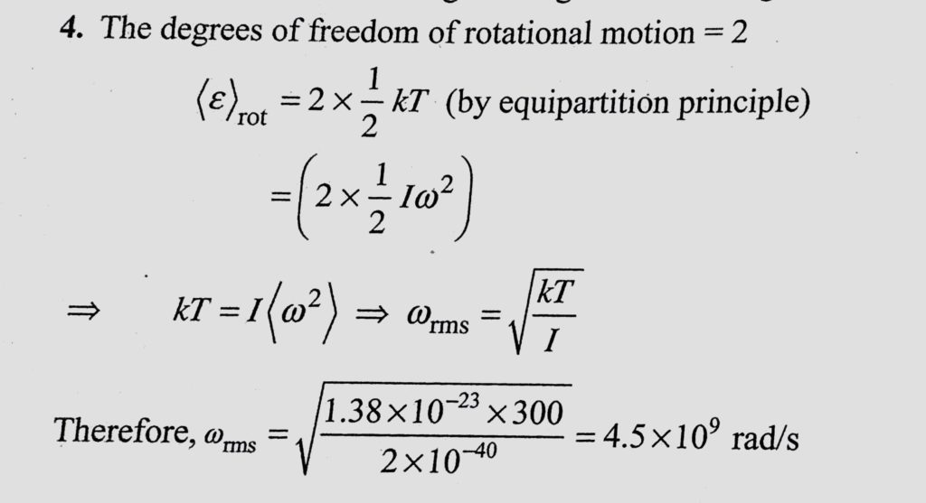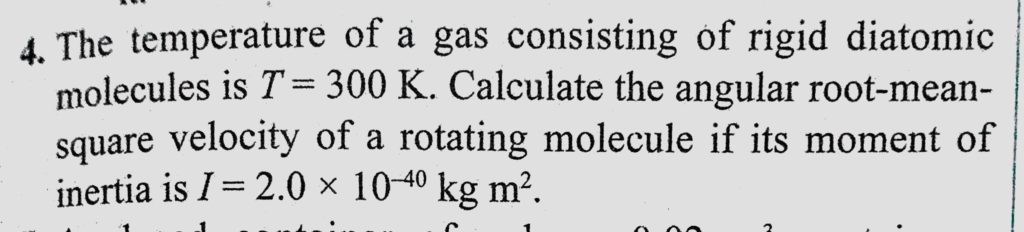 The temperature of a gas consisting of rigid diatomic molecules is T = 300 K. Calculate the angular root-mean-square velocity of a rotating molecule if its moment of inertia is I = 2.0 * 10^-40 kg m^2. A thermally insulated vessel with gaseous nitrogen at a temperature of 27 C moves with velocity 100 m/s^-1. How much (in percentage) and in what way will the gas pressure October 27, 2020 Category: Uncategorised (JEE Advanced Physics by BM Sharma + GMP Solutions) , Facebook Messenger WhatsApp Share this:TwitterFacebook Related