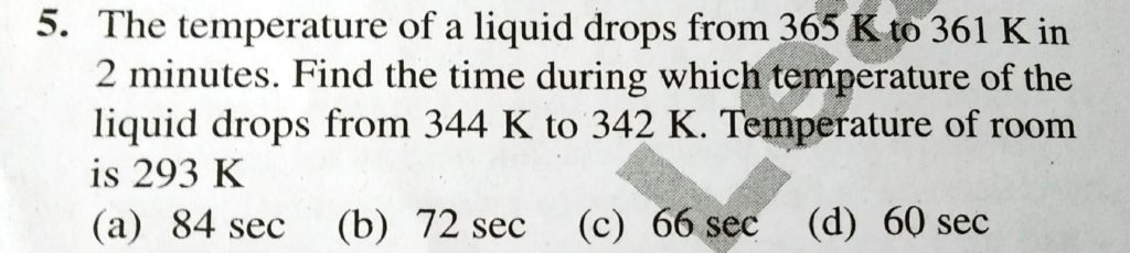 The temperature of a liquid drops from 365 k to 361 k in 2 min. Find the time during which temperature of the liquid drops from 344 k to 342 k. Temperature of room is 293 K The temperature of a liquid drops from 365 k to 361 k in 2 min. Find the time during which temperature of the liquid drops from 344 k to 342 k. Temperature of room is 293 K October 4, 2020 Category: Uncategorised (JEE Advanced Physics by BM Sharma + GMP Solutions) , Facebook Messenger WhatsApp Share this:TwitterFacebook Related