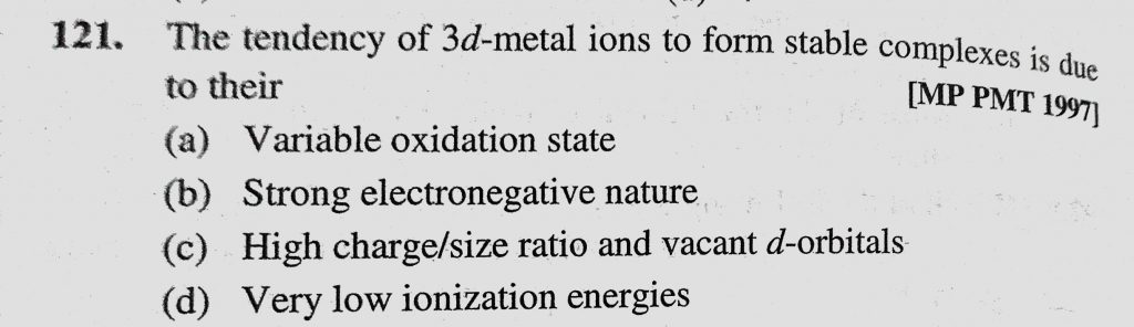 The tendency of 3d-metal ions to form stable complexes is due to their (a) Variable oxidation state (b) Strong electronegative nature The tendency of 3d-metal ions to form stable complexes is due to their (a) Variable oxidation state (b) Strong electronegative nature November 30, 2020 Category: Uncategorised (JEE Advanced Physics by BM Sharma + GMP Solutions) , Facebook Messenger WhatsApp Share this:TwitterFacebook Related