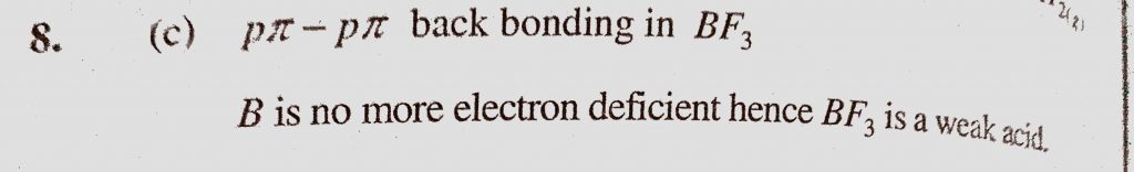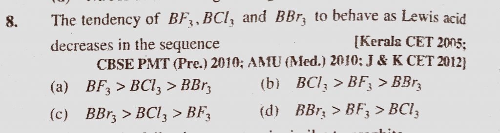 The tendency of BF3, BCl3 and BBr3 to behave as Lewis acid decreases in the sequence (a) BF3 > BCl3 > BBr3 (b) BCl3 > BF3 > BBr3 BCl3 and BBr3 to behave as Lewis acid decreases in the sequence (a) BF3 > BCl3 > BBr3 (b) BCl3 > BF3 > BBr3 The tendency of BF3 November 17, 2020 Category: Uncategorised (JEE Advanced Physics by BM Sharma + GMP Solutions) , Facebook Messenger WhatsApp Share this:TwitterFacebook Related