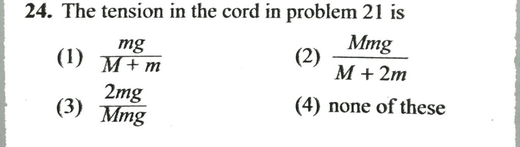 The tension in the cord in problem 21 is The tension in the cord in problem 21 is September 26, 2020 Category: Uncategorised (JEE Advanced Physics by BM Sharma + GMP Solutions) , Facebook Messenger WhatsApp Share this:TwitterFacebook Related