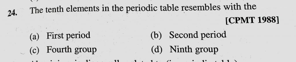 The tenth elements in the periodic table resembles with the (a) First period (b) Second period (c) Fourth group (d) Ninth group The tenth elements in the periodic table resembles with the (a) First period (b) Second period (c) Fourth group (d) Ninth group November 8, 2020 Category: Uncategorised (JEE Advanced Physics by BM Sharma + GMP Solutions) , Facebook Messenger WhatsApp Share this:TwitterFacebook Related