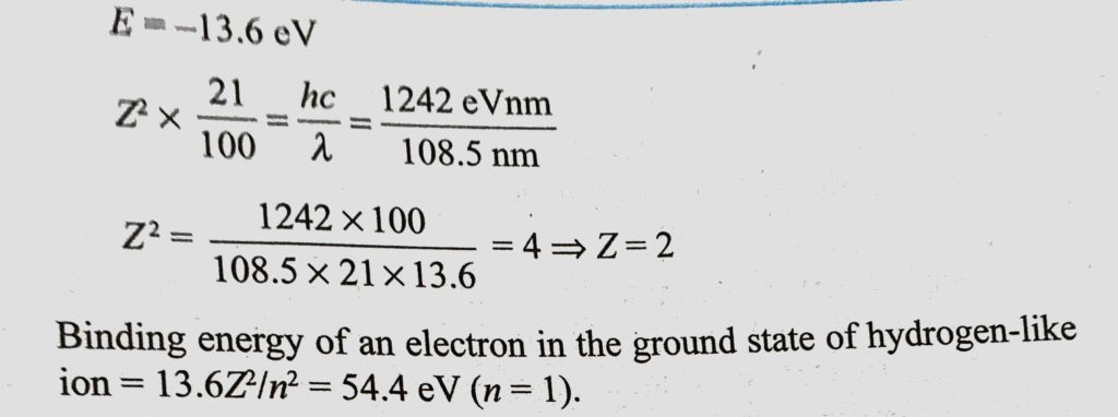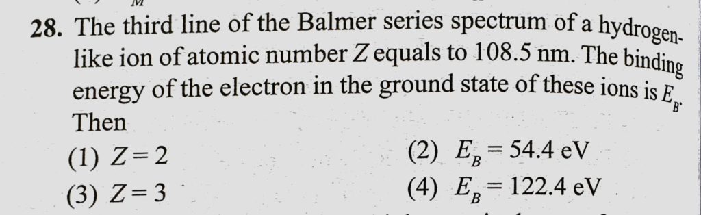 The third line of the Balmer series spectrum of a hydrogen- like ion of atomic number Z equals to 108.5 nm. The binding energy of the electron in the ground state of these ions is EB. The third line of the Balmer series spectrum of a hydrogen- like ion of atomic number Z equals to 108.5 nm. The binding energy of the electron in the ground state of these ions is EB. October 16, 2020 Category: Uncategorised (JEE Advanced Physics by BM Sharma + GMP Solutions) , Facebook Messenger WhatsApp Share this:TwitterFacebook Related