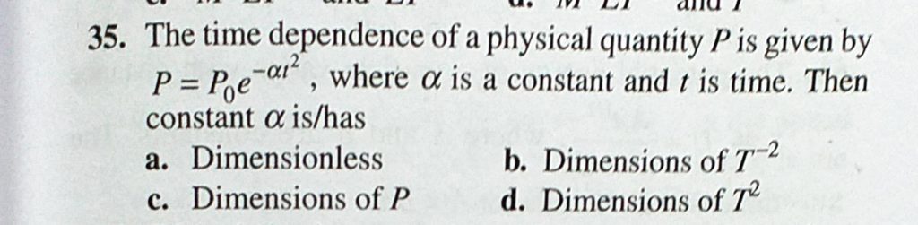 The time dependence of a physical quantity P is given by P = P0e^-alpha t^2, where alpha is a constant and t is time. Then constant alpha is/has The time dependence of a physical quantity P is given by P = P0e^-alpha t^2 where alpha is a constant and t is time. Then constant alpha is/has September 15, 2020 Category: Uncategorised (JEE Advanced Physics by BM Sharma + GMP Solutions) , Facebook Messenger WhatsApp Share this:TwitterFacebook Related