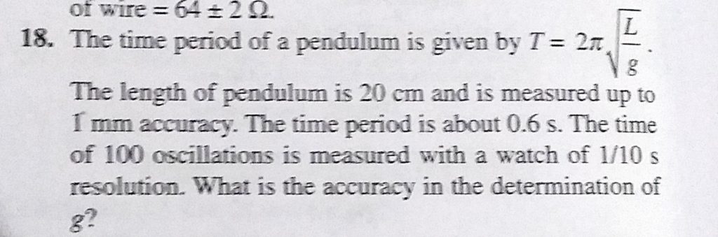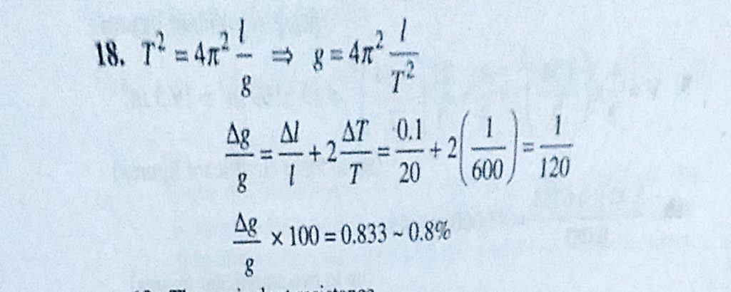 The time period of a pendulum is given by T = 2 pie root L/g. The length of pendulum is 20 cm and is measured up to 1 mm accuracy. The time period is about 0.6 s. The time of 100 oscillations The time period of a pendulum is given by T = 2 pie root L/g. The length of pendulum is 20 cm and is measured up to 1 mm accuracy. The time period is about 0.6 s. The time of 100 oscillations September 14, 2020 Category: Uncategorised (JEE Advanced Physics by BM Sharma + GMP Solutions) , Facebook Messenger WhatsApp Share this:TwitterFacebook Related