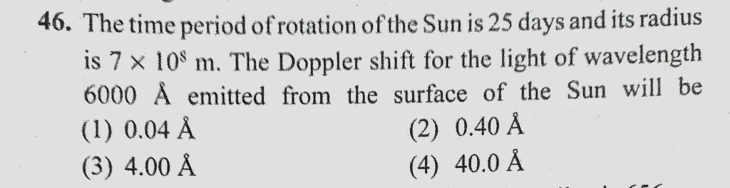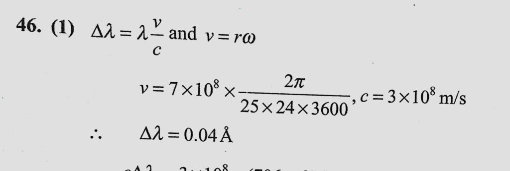 The time period of rotation of the Sun is 25 days and its radius is 7 * 10^8 m. The Doppler shift for the light of wavelength 6000 A emitted from the surface of the Sun will be The time period of rotation of the Sun is 25 days and its radius is 7 * 10^8 m. The Doppler shift for the light of wavelength 6000 A emitted from the surface of the Sun will be October 12, 2020 Category: Uncategorised (JEE Advanced Physics by BM Sharma + GMP Solutions) , Facebook Messenger WhatsApp Share this:TwitterFacebook Related