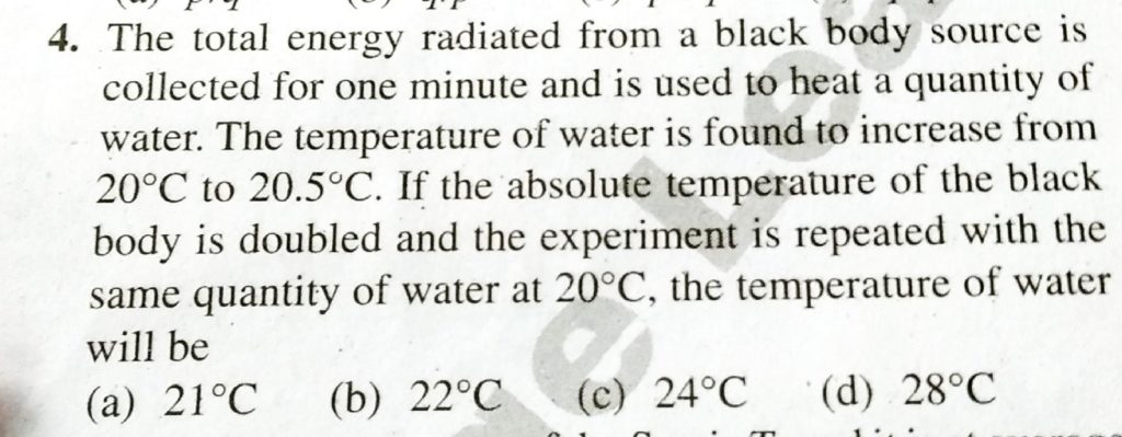 The total energy of a blackbody radiation source is collected for one minute and used to heat water The temperature of the water in creases from 20∘C to 20.5∘C If the absolute temperature of the blackbody is diubled and the experiment repeated which of the following statements would be most nearly COR−RECT ? .