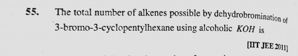 The total number of alkenes possible by dehydrobromination of 3-bromo-3-cyclopentylhexane using alcoholic KOH is The total number of alkenes possible by dehydrobromination of 3-bromo-3-cyclopentylhexane using alcoholic KOH is December 16, 2020 Category: Uncategorised (JEE Advanced Physics by BM Sharma + GMP Solutions) , Facebook Messenger WhatsApp Share this:TwitterFacebook Related