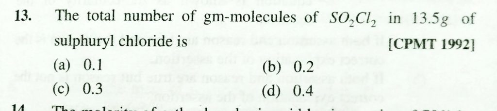The total number of gm – molecules of SO2CL2 IN 13.5 g of sulphuryl chloride is (a) 0.1 (b) 0.2 (c) 0.3 (d) 0.4 The total number of gm - molecules of SO2CL2 IN 13.5 g of sulphuryl chloride is (a) 0.1 (b) 0.2 (c) 0.3 (d) 0.4 November 22, 2020 Category: Uncategorised (JEE Advanced Physics by BM Sharma + GMP Solutions) , Facebook Messenger WhatsApp Share this:TwitterFacebook Related