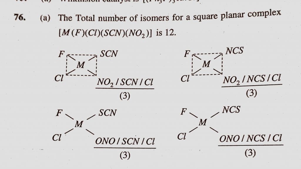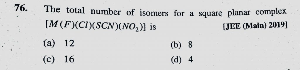 The total number of isomers for a square planar complex (M(F)(Cl)(SCN)(NO2)) is The total number of isomers for a square planar complex (M(F)(Cl)(SCN)(NO2)) is December 5, 2020 Category: Uncategorised (JEE Advanced Physics by BM Sharma + GMP Solutions) , Facebook Messenger WhatsApp Share this:TwitterFacebook Related
