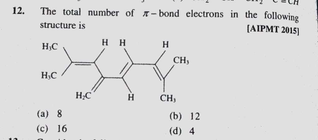 The total number of pie bond electrons in the following structure is (a) 8 (b) 12 (c) 16 (d) 4 The total number of pie bond electrons in the following structure is (a) 8 (b) 12 (c) 16 (d) 4 December 8, 2020 Category: Uncategorised (JEE Advanced Physics by BM Sharma + GMP Solutions) , Facebook Messenger WhatsApp Share this:TwitterFacebook Related