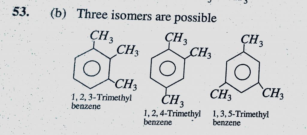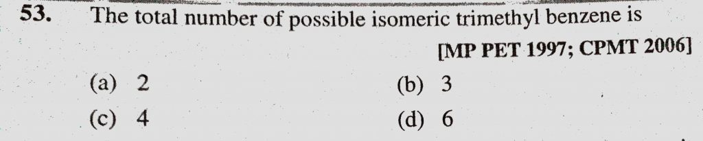 The total number of possible isomeric trimethyl benzene is (a) 2 (b) 3 (c) 4 (d) 6 The total number of possible isomeric trimethyl benzene is (a) 2 (b) 3 (c) 4 (d) 6 December 10, 2020 Category: Uncategorised (JEE Advanced Physics by BM Sharma + GMP Solutions) , Facebook Messenger WhatsApp Share this:TwitterFacebook Related