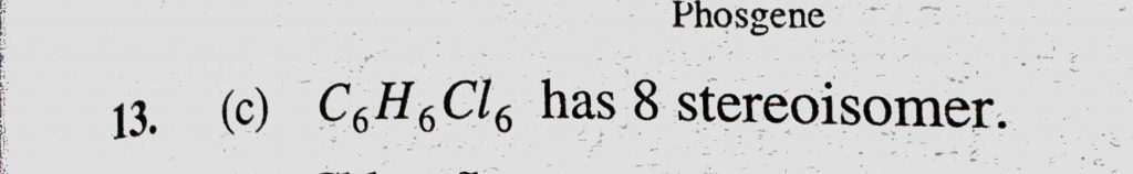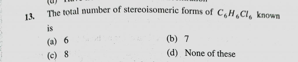 The total number of stereoisomeric forms of C6H6Cl6 known is (a) 6 (b) 7 (c) 8 (d) None of these The total number of stereoisomeric forms of C6H6Cl6 known is (a) 6 (b) 7 (c) 8 (d) None of these February 9, 2021 Category: Uncategorised (JEE Advanced Physics by BM Sharma + GMP Solutions) , Facebook Messenger WhatsApp Share this:TwitterFacebook Related