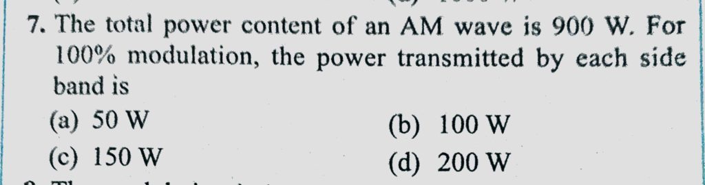 The total power content of an AM wave is 900 W. For 100% modulation, the power transmitted by each side band is the power transmitted by each side band is The total power content of an AM wave is 900 W. For 100% modulation October 22, 2020 Category: Uncategorised (JEE Advanced Physics by BM Sharma + GMP Solutions) , Facebook Messenger WhatsApp Share this:TwitterFacebook Related