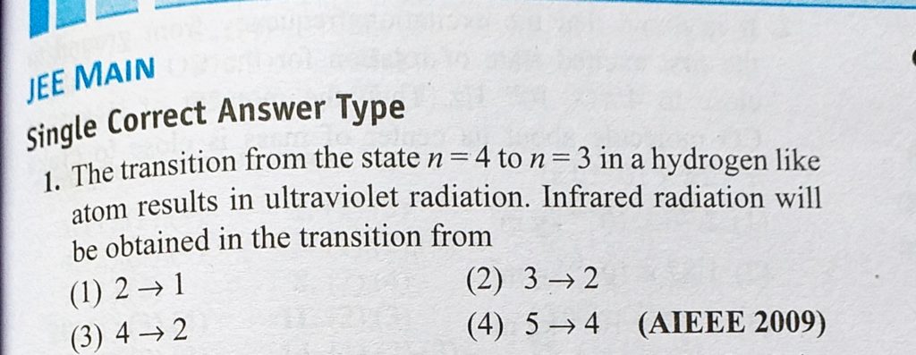 The transition from the state n = 4 to n = 3 in a hydrogen like atom results in ultraviolet radiation. Infrared radiation will be obtained in the transition from The transition from the state n = 4 to n = 3 in a hydrogen like atom results in ultraviolet radiation. Infrared radiation will be obtained in the transition from October 16, 2020 Category: Uncategorised (JEE Advanced Physics by BM Sharma + GMP Solutions) , Facebook Messenger WhatsApp Share this:TwitterFacebook Related