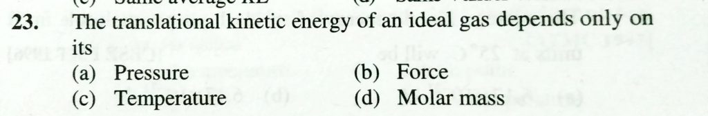 The translation kinetic energy of an ideal gas depends only on its (a) pressure (b) force (c) temperature (d) Molar mass The translation kinetic energy of an ideal gas depends only on its (a) pressure (b) force (c) temperature (d) Molar mass February 11, 2021 Category: Uncategorised (JEE Advanced Physics by BM Sharma + GMP Solutions) , Facebook Messenger WhatsApp Share this:TwitterFacebook Related