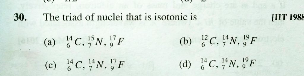 The triad of nuclie that is isotonic is (a) 14 6 C , 15 7 N , 17 9 F (b) 12 6 C , 14 7 N , 19 9 F (c) 14 6 C , 14 7 N , 17 9 F (d) 14 6 C , 14 7 N , 19 9 F 14 7 N 15 7 N 17 9 F (b) 12 6 C 17 9 F (d) 14 6 C 19 9 F 19 9 F (c) 14 6 C The triad of nuclie that is isotonic is (a) 14 6 C November 30, 2020 Category: Uncategorised (JEE Advanced Physics by BM Sharma + GMP Solutions) , Facebook Messenger WhatsApp Share this:TwitterFacebook Related