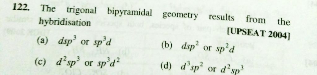 The trigonal bipyramidal geometry results from the hybridisation The trigonal bipyramidal geometry results from the hybridisation December 7, 2020 Category: Uncategorised (JEE Advanced Physics by BM Sharma + GMP Solutions) , Facebook Messenger WhatsApp Share this:TwitterFacebook Related