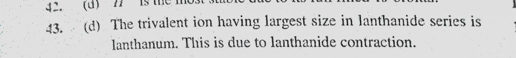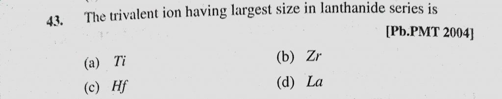 The trivalent ion having largest size in lanthanide series is (a) Ti (b) Zr (c) Hf (d) La The trivalent ion having largest size in lanthanide series is (a) Ti (b) Zr (c) Hf (d) La November 9, 2020 Category: Uncategorised (JEE Advanced Physics by BM Sharma + GMP Solutions) , Facebook Messenger WhatsApp Share this:TwitterFacebook Related