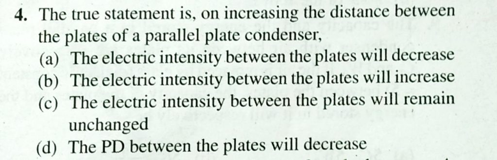 The true statement is, on increasing the distance between the plates of a parallel plate condenser, on increasing the distance between the plates of a parallel plate condenser The true statement is September 18, 2020 Category: Uncategorised (JEE Advanced Physics by BM Sharma + GMP Solutions) , Facebook Messenger WhatsApp Share this:TwitterFacebook Related