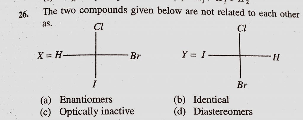 The two compounds given below are not related to each other as (a) Enantiomers (b) Identical (c) Optically inactive (d) Diastereomers The two compounds given below are not related to each other as (a) Enantiomers (b) Identical (c) Optically inactive (d) Diastereomers December 12, 2020 Category: Uncategorised (JEE Advanced Physics by BM Sharma + GMP Solutions) , Facebook Messenger WhatsApp Share this:TwitterFacebook Related