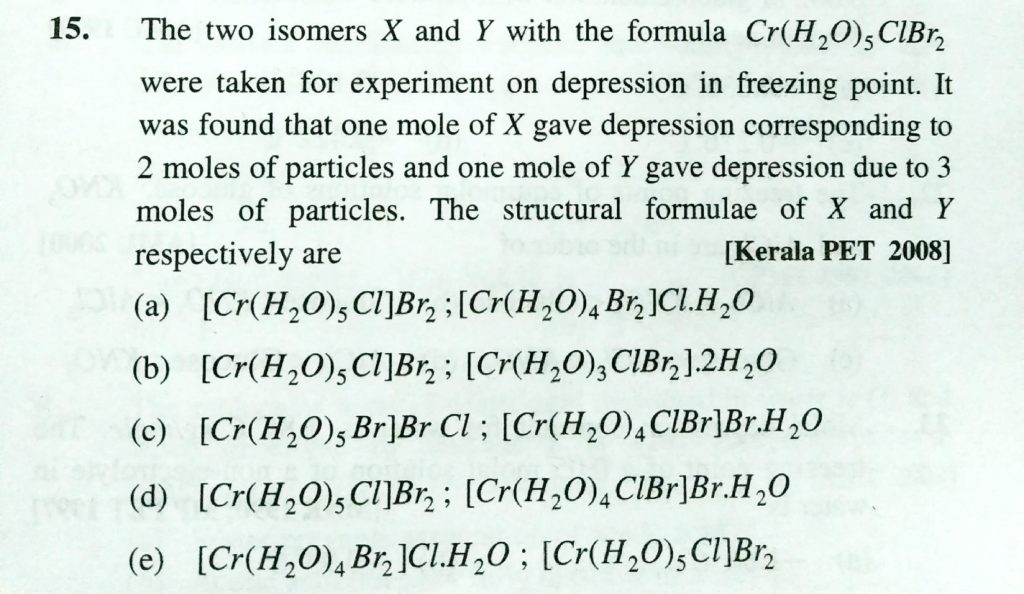 The two isomers X and Y with the formula Cr(H2O)5ClBr were taken for experiment on depression in freezing point. It was found that one mole of X gave depression corresponding to 2 moles of particles and one mole of Y gave depression to 3 moles of particles. The structural formulae of X and Y raspectively are