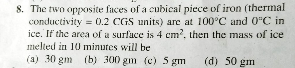 The two opposite faces of a cubical piece of iron (thermal conductivity = 0.2 CGS units) are at 100∘C and 0∘C in ice. If the area of a surface is 4 cm^2 , then the mass of ice melted in 10 minutes will b The two opposite faces of a cubical piece of iron (thermal conductivity = 0.2 CGS units) are at 100∘C and 0∘C in ice. If the area of a surface is 4 cm^2 then the mass of ice melted in 10 minutes will b October 4, 2020 Category: Uncategorised (JEE Advanced Physics by BM Sharma + GMP Solutions) , Facebook Messenger WhatsApp Share this:TwitterFacebook Related