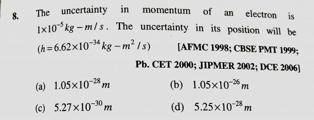 The uncertainity in momentum of an electron is 1 x 10^-5 kg-m/s. The uncertainty in its position will be The uncertainity in momentum of an electron is 1 x 10^-5 kg-m/s. The uncertainty in its position will be November 28, 2020 Category: Uncategorised (JEE Advanced Physics by BM Sharma + GMP Solutions) , Facebook Messenger WhatsApp Share this:TwitterFacebook Related