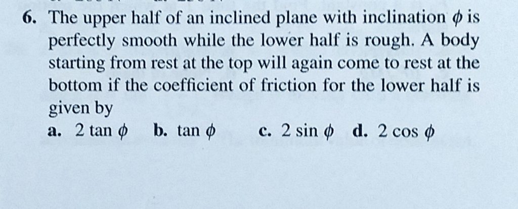 The upper half of an inclined plane with inclination phi is perfectly smooth while the lower half is rough. A body starting from rest at the top will again come to rest at the bottom if the coefficient A prismatic block of mass m is kept on a groove. The bottom line of the groove makes an angle theta with horizontal. The angle between the flat surfaces 1 and 2 making the groove is phi. October 1, 2020 Category: Uncategorised (JEE Advanced Physics by BM Sharma + GMP Solutions) , Facebook Messenger WhatsApp Share this:TwitterFacebook Related