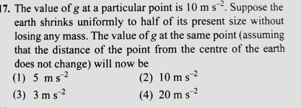 The value of g at a particular point is 10 m/s^2. Suppose the earth shrinks uniformly to half of its present size without losing any mass. The value of g at the same point (assuming that the distance of the point from the centre of the earth does not change) will now be