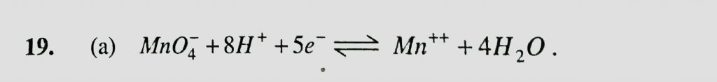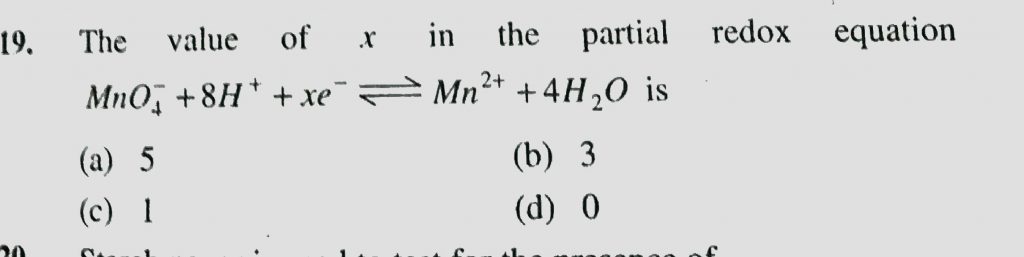 The value of x in the partial redox equation MnO4^- +8H^+ xe gives Mn^2+ +4 H2O is The value of x in the partial redox equation MnO4^- +8H^+ xe gives Mn^2+ +4 H2O is November 24, 2020 Category: Uncategorised (JEE Advanced Physics by BM Sharma + GMP Solutions) , Facebook Messenger WhatsApp Share this:TwitterFacebook Related