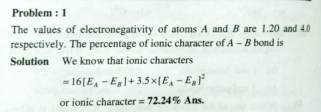 The values of electronegativity of atoms A and B are 1.20 and 4.0 respectively . The percentage of ionic character of A – B bond is The values of electronegativity of atoms A and B are 1.20 and 4.0 respectively . The percentage of ionic character of A - B bond is December 10, 2020 Category: Uncategorised (JEE Advanced Physics by BM Sharma + GMP Solutions) , Facebook Messenger WhatsApp Share this:TwitterFacebook Related