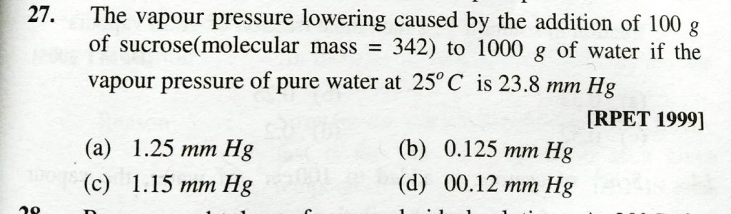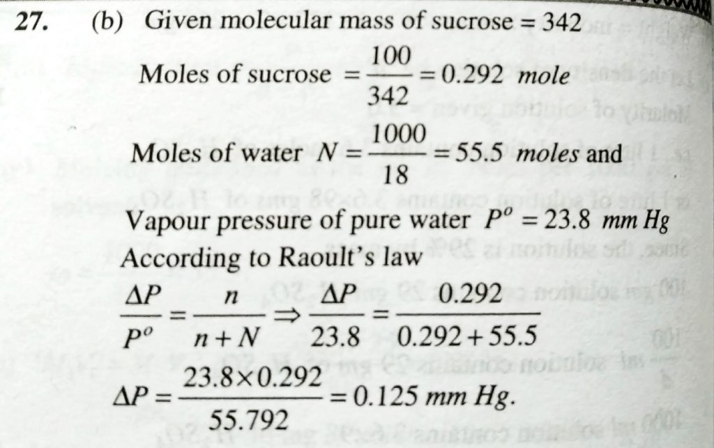 The vapour pressure lowering caused by the addition of sucrose ( molecular mass = 342 ) to 1000 g of water if the vapour pressure of pure water at 25 degree C is 23.8 mm Hg The vapour pressure lowering caused by the addition of sucrose ( molecular mass = 342 ) to 1000 g of water if the vapour pressure of pure water at 25 degree C is 23.8 mm Hg December 12, 2020 Category: Uncategorised (JEE Advanced Physics by BM Sharma + GMP Solutions) , Facebook Messenger WhatsApp Share this:TwitterFacebook Related