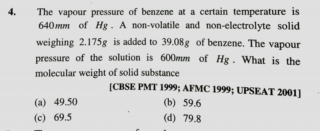 The vapour pressure of benzene at a certain temperature is 640 mm of Hg. A non-volatile and non-electrolytic solid, weighing 2.175 g, is added to 39.08 g of benzene. The vapour pressure of the solution is 600 mm of Hg. What is the molecular mass (in AMU) of the solid substance?