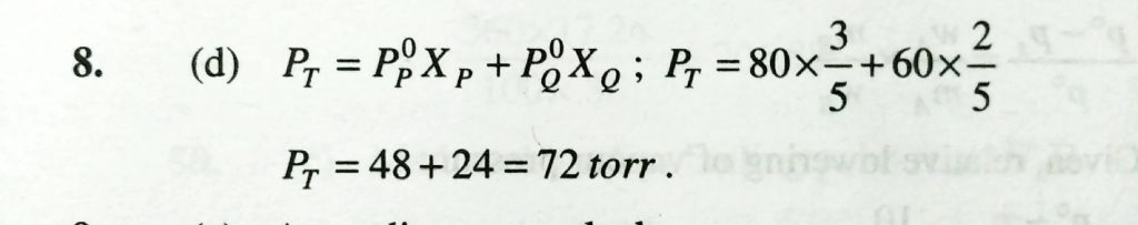 The vapour pressure of two liquids P and Q are 80 and 60 torr, respectively. The total vap[our of solution obtained by mixing 3 mole of P and 2 mole of Q would be respectively. The total vap[our of solution obtained by mixing 3 mole of P and 2 mole of Q would be The vapour pressure of two liquids P and Q are 80 and 60 torr December 12, 2020 Category: Uncategorised (JEE Advanced Physics by BM Sharma + GMP Solutions) , Facebook Messenger WhatsApp Share this:TwitterFacebook Related
