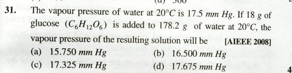 The vapour pressure of water at 20 degree C is 17.5 mm Hg. If 18 g of glucose ( C6 H12 O6 ) is added to 178.2 g of water at 20 degree C , the vapour pressure of the resulting solution will be the vapour pressure of the resulting solution will be The vapour pressure of water at 20 degree C is 17.5 mm Hg. If 18 g of glucose ( C6 H12 O6 ) is added to 178.2 g of water at 20 degree C December 12, 2020 Category: Uncategorised (JEE Advanced Physics by BM Sharma + GMP Solutions) , Facebook Messenger WhatsApp Share this:TwitterFacebook Related