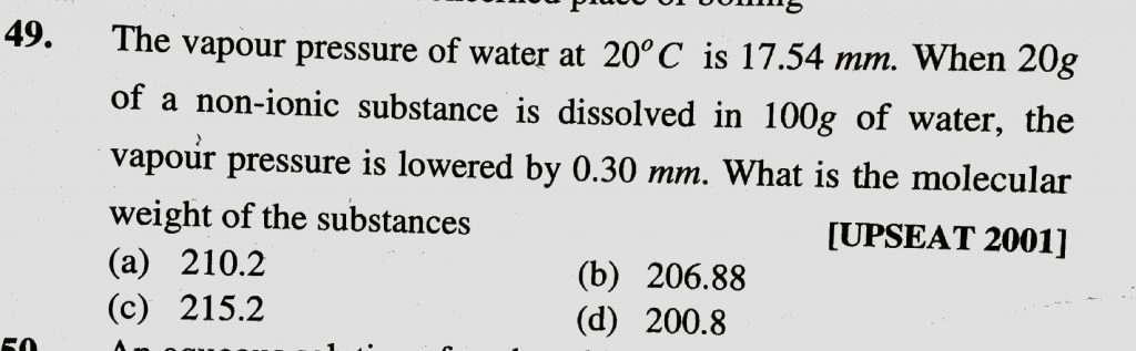 The vapour pressure of water at 20 degree C is 17.54 mm. When 20 g of a non – ionic substance is dissolved in 100 g of water, the vapour is lowered by 0.30 mm. what is the molecular weight of the substances the vapour is lowered by 0.30 mm. what is the molecular weight of the substances The vapour pressure of water at 20 degree C is 17.54 mm. When 20 g of a non - ionic substance is dissolved in 100 g of water December 12, 2020 Category: Uncategorised (JEE Advanced Physics by BM Sharma + GMP Solutions) , Facebook Messenger WhatsApp Share this:TwitterFacebook Related