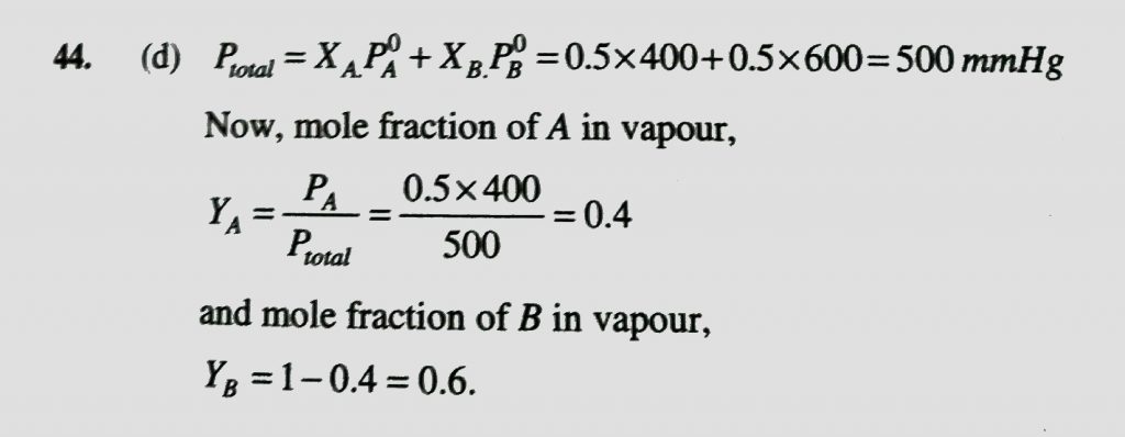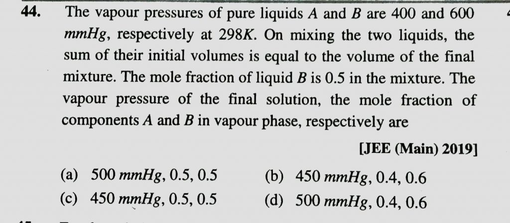 The vapour pressures of pure liquids A and B are 400 and 600 mm Hg respectively at 298 K. On mixing the two liquids, the sum of their initial volumes is equal to the volume of the final mixture. The mole fraction of liquid B is 0.5 in the mixture. The vapour pressure of the final solution, the mole fractions of components A and B in vapour phase, respectively are :