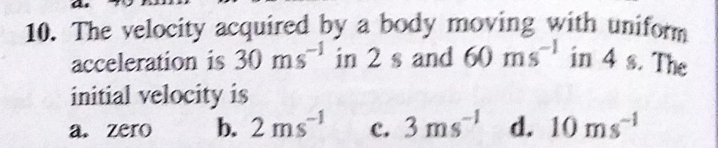 The velocity acquired by a body moving with uniform acceleration is 30 m/s in 2 s and 60 m /s in 4 s. The initial velocity is a. zero b. 2 m/s c. 3 m/s d. 10 m/s The velocity acquired by a body moving with uniform acceleration is 30 m/s in 2 s and 60 m /s in 4 s. The initial velocity is a. zero b. 2 m/s c. 3 m/s d. 10 m/s September 19, 2020 Category: Uncategorised (JEE Advanced Physics by BM Sharma + GMP Solutions) , Facebook Messenger WhatsApp Share this:TwitterFacebook Related