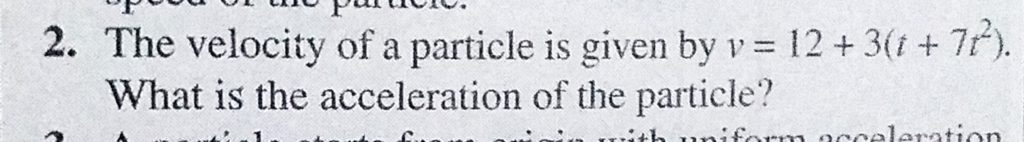 The velocity of a particle is given by v = 12 + 3(t + 7t^2). What is the acceleration of the particle? The velocity of a particle is given by v = 12 + 3(t + 7t^2). What is the acceleration of the particle? September 16, 2020 Category: Uncategorised (JEE Advanced Physics by BM Sharma + GMP Solutions) , Facebook Messenger WhatsApp Share this:TwitterFacebook Related
