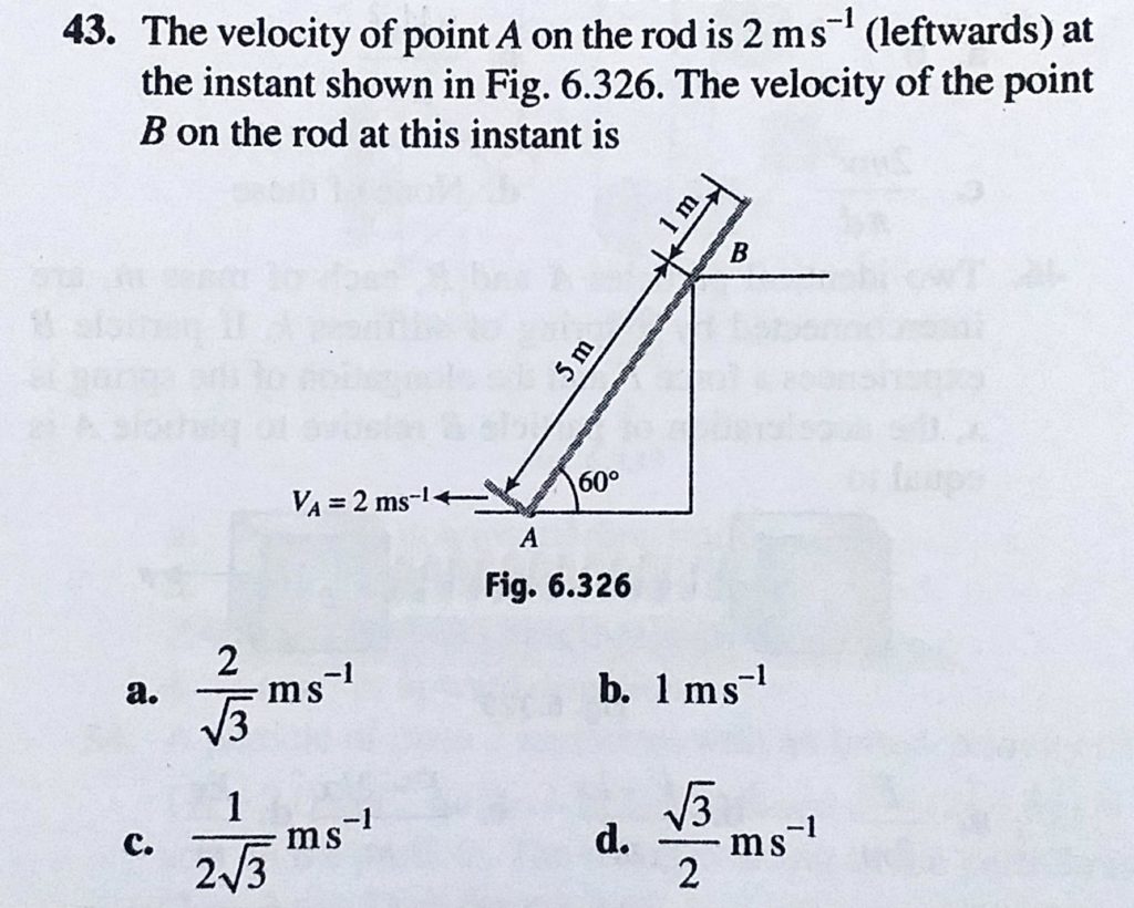 The velocity of point A on the rod is 2 m/s (leftwards) at the instant shown in Fig. 6.326. The velocity of the point B on the rod at this instant is The velocity of point A on the rod is 2 m/s (leftwards) at the instant shown in Fig. 6.326. The velocity of the point B on the rod at this instant is September 29, 2020 Category: Uncategorised (JEE Advanced Physics by BM Sharma + GMP Solutions) , Facebook Messenger WhatsApp Share this:TwitterFacebook Related