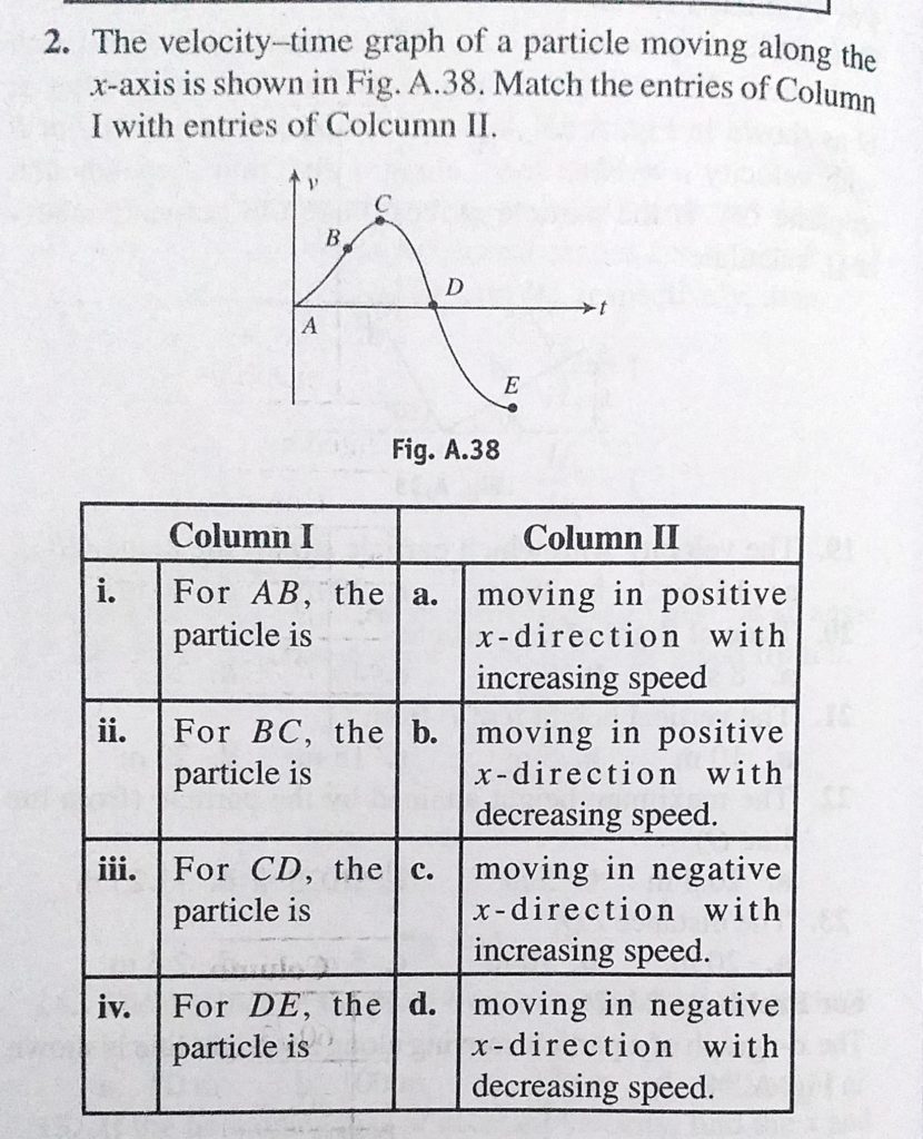 The velocity-time graph of a particle moving along the x-axis is shown in Fig.A.38. Match the entries of column 1 with entries of column 2. The velocity-time graph of a particle moving along the x-axis is shown in Fig.A.38. Match the entries of column 1 with entries of column 2. September 25, 2020 Category: Uncategorised (JEE Advanced Physics by BM Sharma + GMP Solutions) , Facebook Messenger WhatsApp Share this:TwitterFacebook Related