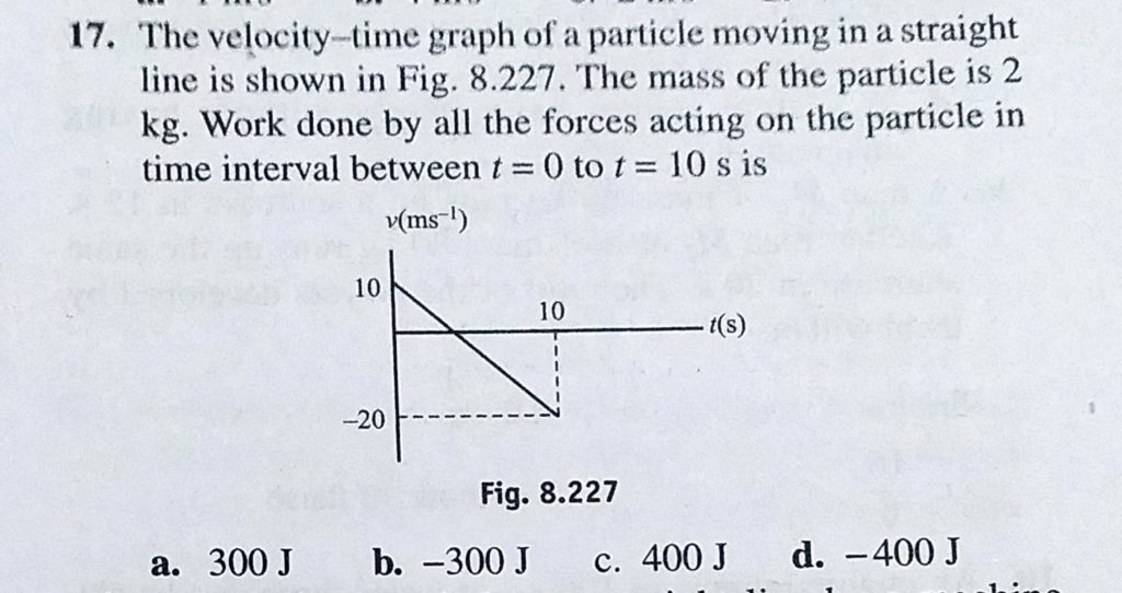 The velocity-time graph of a particle moving in a straight line is shown in Fig. 8.227. The mass of the particle is 2 kg. Work done by all the forces acting on the particle in time interval between The velocity-time graph of a particle moving in a straight line is shown in Fig. 8.227. The mass of the particle is 2 kg. Work done by all the forces acting on the particle in time interval between October 3, 2020 Category: Uncategorised (JEE Advanced Physics by BM Sharma + GMP Solutions) , Facebook Messenger WhatsApp Share this:TwitterFacebook Related