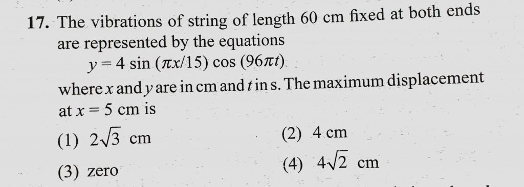 The vibrations of string of length 60 cm fixed at both ends are represented by the equations y = 4 sin (pie x / 15) cos (96pie t) where x and y are in cm and t in s. The maximum displacement The vibrations of string of length 60 cm fixed at both ends are represented by the equations y = 4 sin (pie x / 15) cos (96pie t) where x and y are in cm and t in s. The maximum displacement November 6, 2020 Category: Uncategorised (JEE Advanced Physics by BM Sharma + GMP Solutions) , Facebook Messenger WhatsApp Share this:TwitterFacebook Related