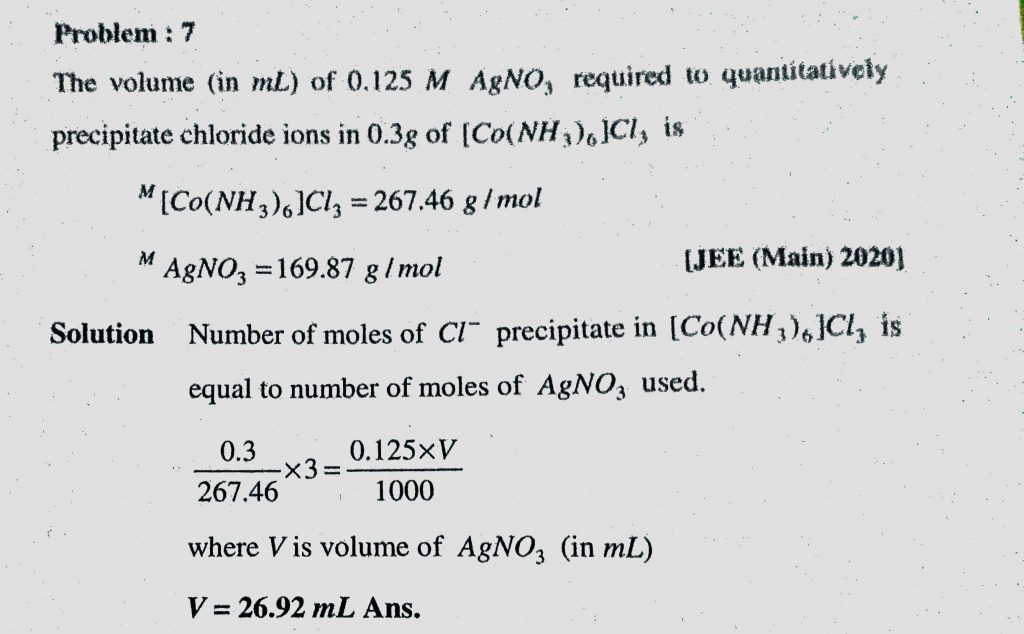 The volume (in mL) of 0.125 M AgNO3 required to quantitatively precipitate chloride ions in 0.3 g of (Co(NH3)6)Cl3 is The volume (in mL) of 0.125 M AgNO3 required to quantitatively precipitate chloride ions in 0.3 g of (Co(NH3)6)Cl3 is December 6, 2020 Category: Uncategorised (JEE Advanced Physics by BM Sharma + GMP Solutions) , Facebook Messenger WhatsApp Share this:TwitterFacebook Related