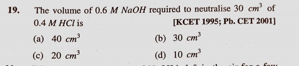The volume of 0.6 M NaOH required to neutralise 30 cm^3 of 0.4 M HCl is (a) 40 cm^3 (b) 30 cm^3 The volume of 0.6 M NaOH required to neutralise 30 cm^3 of 0.4 M HCl is (a) 40 cm^3 (b) 30 cm^3 December 7, 2020 Category: Uncategorised (JEE Advanced Physics by BM Sharma + GMP Solutions) , Facebook Messenger WhatsApp Share this:TwitterFacebook Related