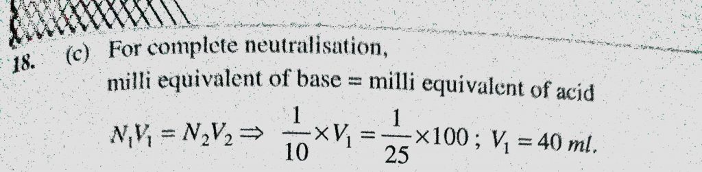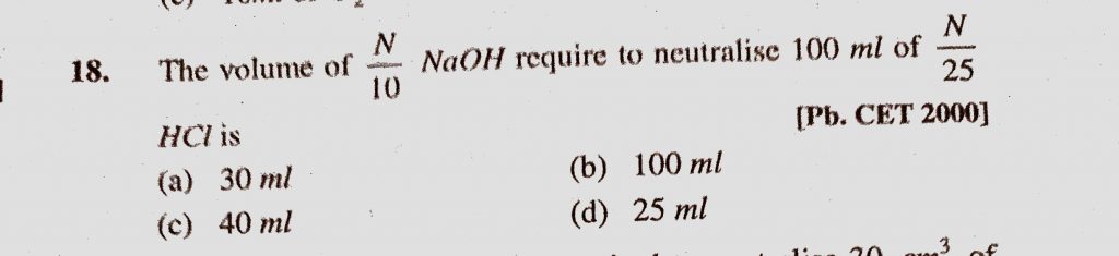 The volume of N/10 NaOH require to neutralise 100 ml of N/25 HCl is The volume of N/10 NaOH require to neutralise 100 ml of N/25 HCl is December 7, 2020 Category: Uncategorised (JEE Advanced Physics by BM Sharma + GMP Solutions) , Facebook Messenger WhatsApp Share this:TwitterFacebook Related