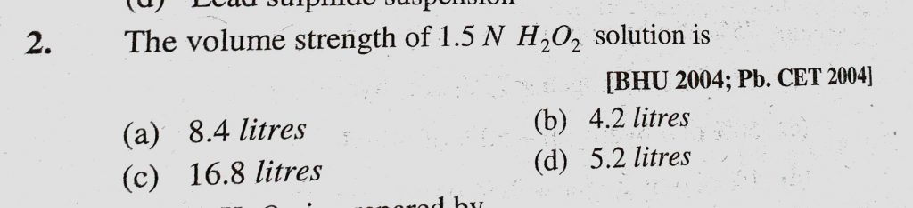 The volume strength of 1.5 N H2O2 solution is (a) 8.4 litres (b) 4.2 litres (c) 16.8 litres (d) 5.2 litres The volume strength of 1.5 N H2O2 solution is (a) 8.4 litres (b) 4.2 litres (c) 16.8 litres (d) 5.2 litres November 13, 2020 Category: Uncategorised (JEE Advanced Physics by BM Sharma + GMP Solutions) , Facebook Messenger WhatsApp Share this:TwitterFacebook Related